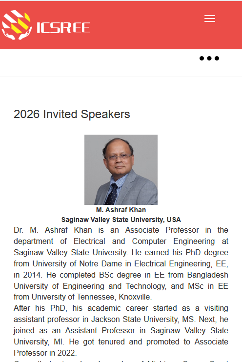 2026 Invited Speakers from ICSREE M. Ashraf KhanSaginaw Valley State University, USA Dr. M. Ashraf Khan is an Associate Professor...